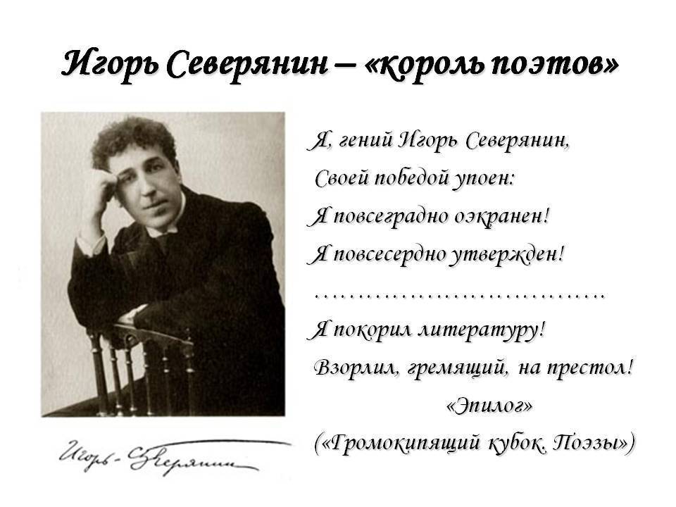 - В 1918 году получил звание «Король поэтов» благодаря выступлению в московском политехническом музее, при этом обойдя по баллам Маяковского. Среди слушателей творчества Маяковского и творчества Северянина чуть не разразился скандал, обстановка была накалена.