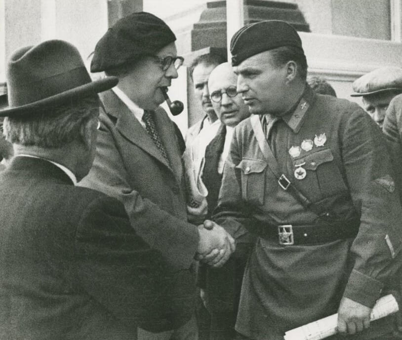 Депутаты Верховного Совета СССР писатель А. Н. Толстой, летчик В. П. Чкалов и актер И. М. Москвин. 1938 г.